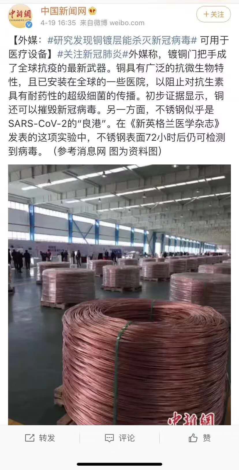 2020年注定是不平凡的一年,新冠病毒疫情搞得世界都变了样了。庆幸于生在中国,在最早发现疫情的惶恐到控制,国家虽然花了钱财,医生护士义工慷慨人士投进了时间精力金钱甚至生命后,换来了国家的安全,换来了世界的另眼相看,甚至平时爱说国家某些不足之处的人现在也认识了国家的不易,国家的伟大,爱国之声洋溢在各个角落,作为一个中国小微企业,我们也愿意奉献自己的力所能及的社会责任,工作之余发现我们所生产的铜门、镀铜门还能成为抗疫的武器。铜具有广泛的抗微生物特性,以阻止对抗生素具有耐药性的超级细菌的传播。希望在我们的努力下推而广之。