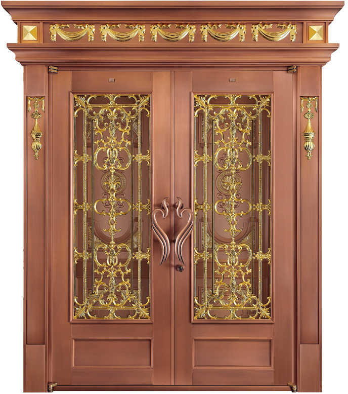产品加工:1.钢质材料经过抗氧化处理后,剪板折弯,焊接成型,2.紫铜板经过氧化拉丝封釉,剪板折弯,依照钢 内胆大小做处各分件后,粘贴于内胆表面,手工工制作成分较多,故此铜门对手工要求是比较高的