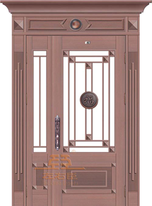 产品加工:1.钢质材料经过抗氧化处理后,剪板折弯,焊接成型,2.紫铜板经过氧化拉丝封釉,剪板折弯,依照钢        内胆大小做处各分件后,粘贴于内胆表面,手工工制作成分较多,故此铜门对手工要求是比较高的
