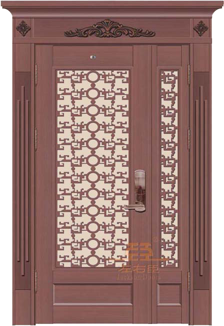 产品加工:1.钢质材料经过抗氧化处理后,剪板折弯,焊接成型,2.紫铜板经过氧化拉丝封釉,剪板折弯,依照钢 内胆大小做处各分件后,粘贴于内胆表面,手工工制作成分较多,故此铜门对手工要求是比较高的