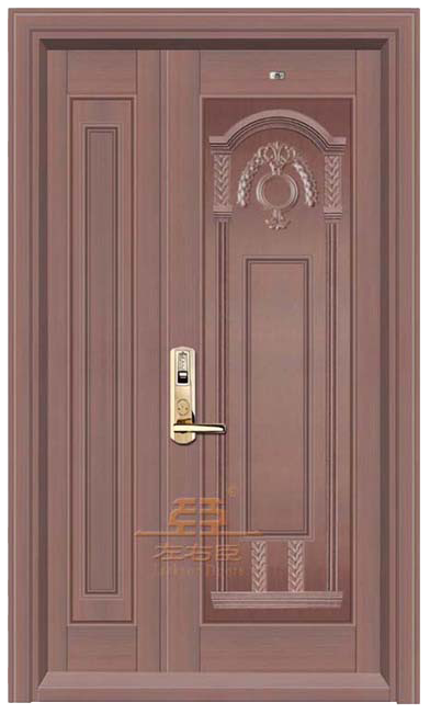 产品加工:1.钢质材料经过抗氧化处理后,剪板折弯,焊接成型,2.紫铜板经过氧化拉丝封釉,剪板折弯,依照钢        内胆大小做处各分件后,粘贴于内胆表面,手工工制作成分较多,故此铜门对手工要求是比较高的