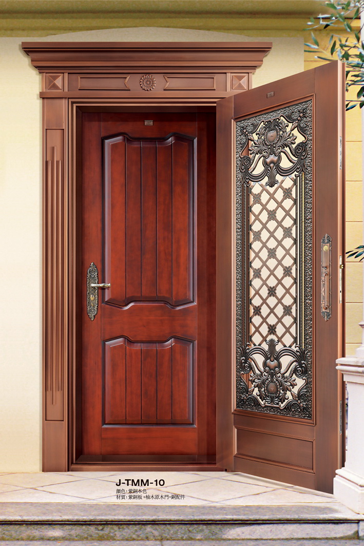 产品加工:1.钢质材料经过抗氧化处理后,剪板折弯,焊接成型,2.紫铜板经过氧化拉丝封釉,剪板折弯,依照钢        内胆大小做处各分件后,粘贴于内胆表面,手工工制作成分较多,故此铜门对手工要求是比较高的