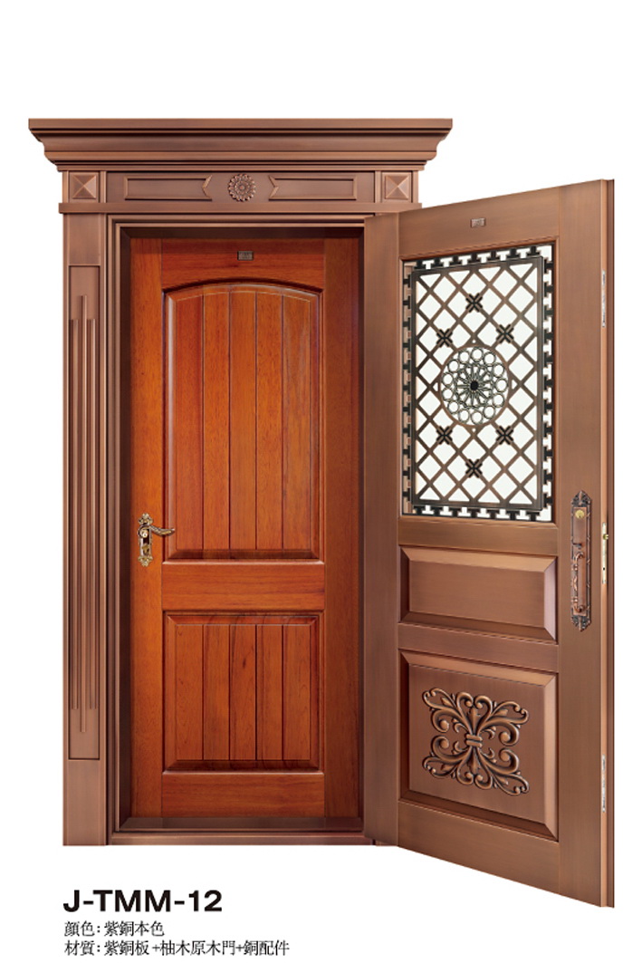 产品加工:1.钢质材料经过抗氧化处理后,剪板折弯,焊接成型,2.紫铜板经过氧化拉丝封釉,剪板折弯,依照钢        内胆大小做处各分件后,粘贴于内胆表面,手工工制作成分较多,故此铜门对手工要求是比较高的